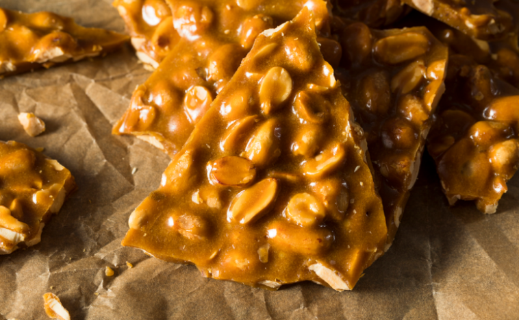 - In a saucepan over medium heat, place the sugar, butter and peanuts;
