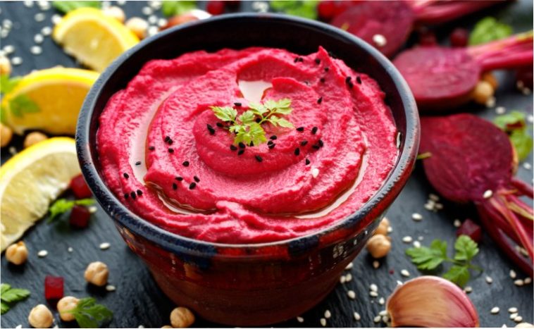 Snack time and appetizers will be even tastier with this homus. After cooking the beets and chickpeas, process them with tahine, lemon, olive oil and garlic. This paste is ideal to serve with bread and toast.
