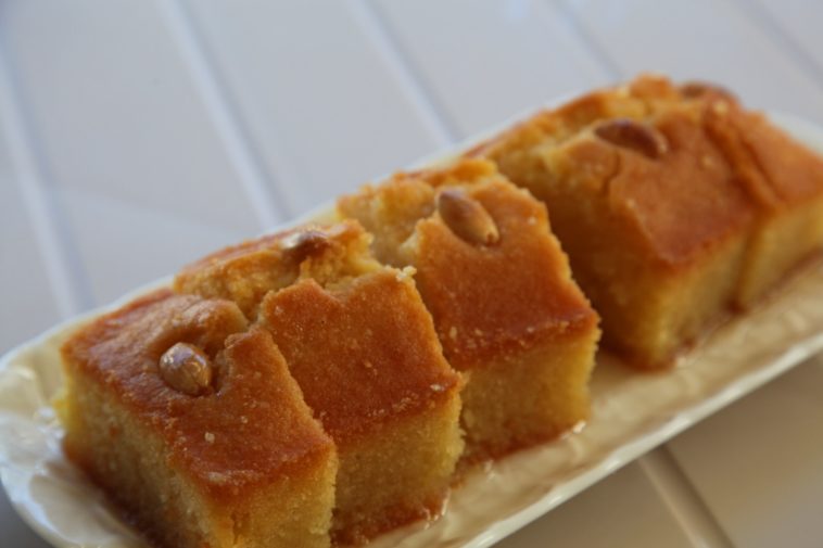 Cut the semolina cake into small squares and, with the help of a spoon, wet your cake with the syrup!