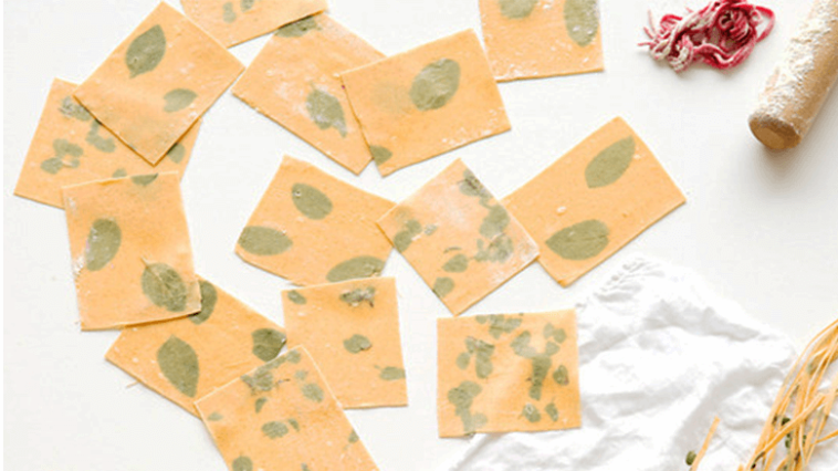 This stamping process can be done using edible flowers, very thin sheets of blanched (lightly cooked) or dehydrated vegetables or cutouts of colored pasta.