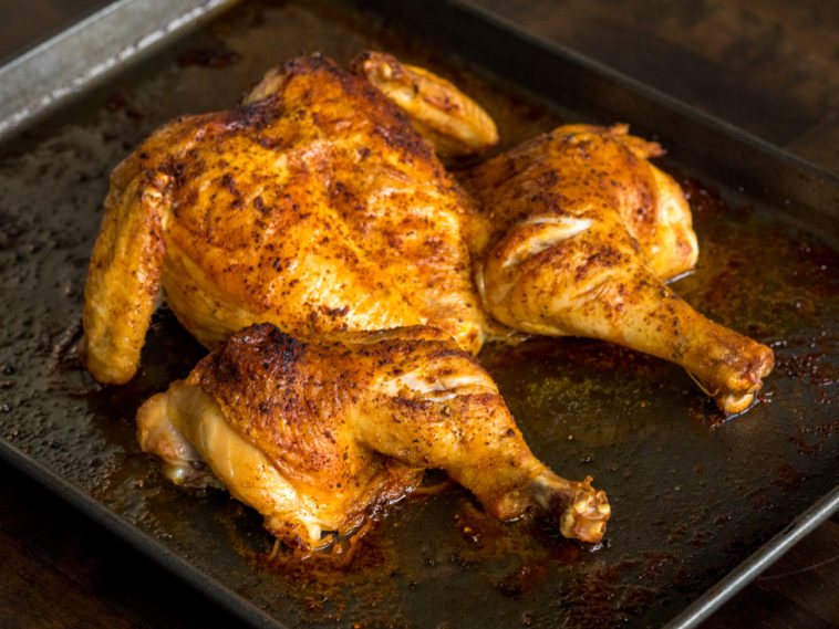 The theory is that a spatchcocked bird—which has had the backbone removed, so it can lay relatively flat while cooking— »cooks more evenly in an oven » and is « easier to flip on a grill. » … Spatchcocking a chicken (or turkey) does not save time, and does not make for more even cooking.