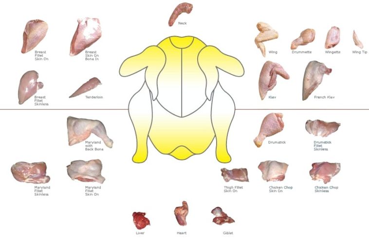 Whole chickens are dollars cheaper per pound than the plastic trays of bundled chicken parts, and only slightly more expensive per pound than chicken backs and offal. … Common chicken cuts: legs, tenders, and breast halves.
