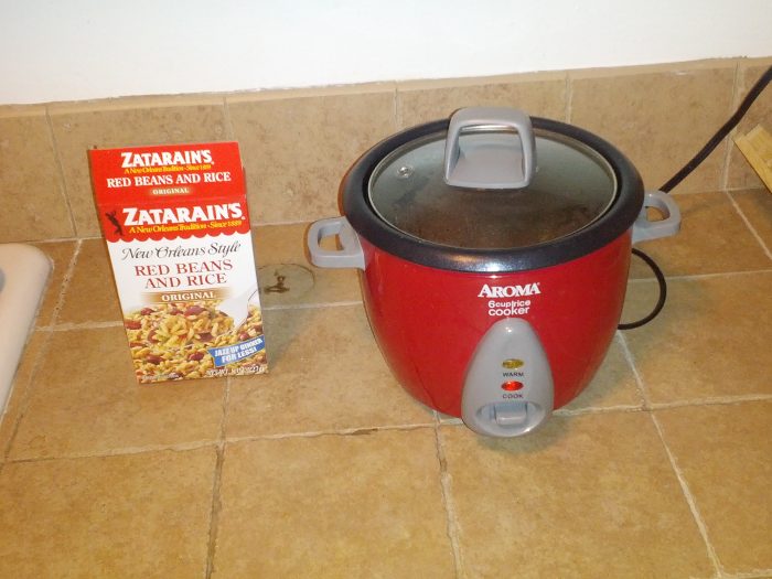 Zatarain’s jambalaya in rice cooker: one can of chicken, one small sausage (all i had) diced. Sautee until is heated through and has a bit of color. Dump meat in rice cooker and add box of zatarain’s jambalaya plus two cups of water and half cup of tomato sauce (as recommended on the box).