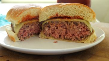 Make into 6 – 8 patties. Grill on outside grill. We use a gas grill at 300 degrees and cook time is about 10 minutes, flipping the burgers a couple of times. Eliminate excessive grease by pressing the burgers after each flip.