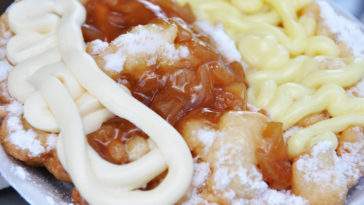 “An elephant ear is sweet pastry dough, and a funnel cake is a batter, like a pancake or waffle cake batter,” Tapp said. “So totally different but similar, like people.” … Set on ruffle-edged paper plates, cinnamon sugar dusts the ear, then powdered sugar snows over the funnel cake.