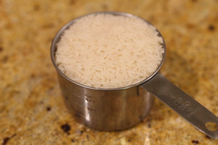 Measure one cup of long grain white rice into a cup and level it off. One cup of dry rice will make enough cooked rice for two to three adult servings. (Or two adults and two small children.) The cool thing about this recipe is it is proportional.