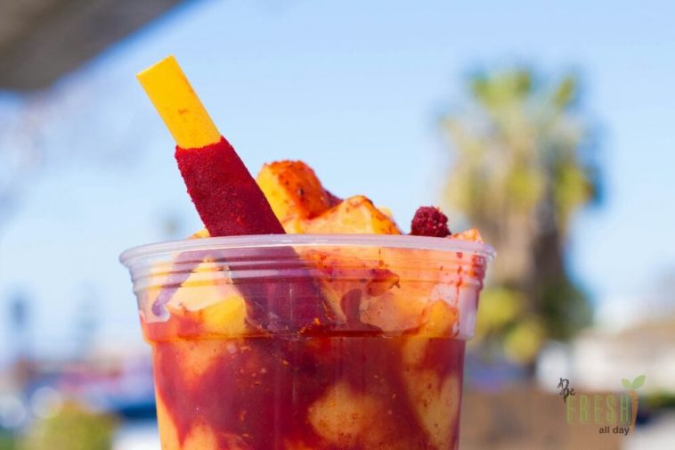 Tajin is a popular brand of Mexican chile lime seasoning that’s widely available in the US. … Chamoy is a thick sauce and condiment (similar to the consistency of honey or syrup) made from pickled fruit like apricots, plums or mangos mixed with spicy chiles and a salty brine.