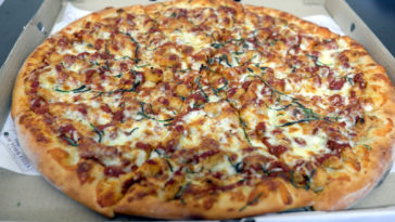 - Papa John’s Pepperoni, Sausage, and Six Cheese Pizza.