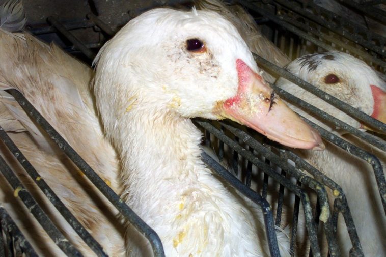 To produce foie gras, workers grab ducks and geese by the neck, shove metal pipes down their throats, and pump massive amounts of grain and fat into their stomachs several times a day in a barbaric process known as “gavage”.