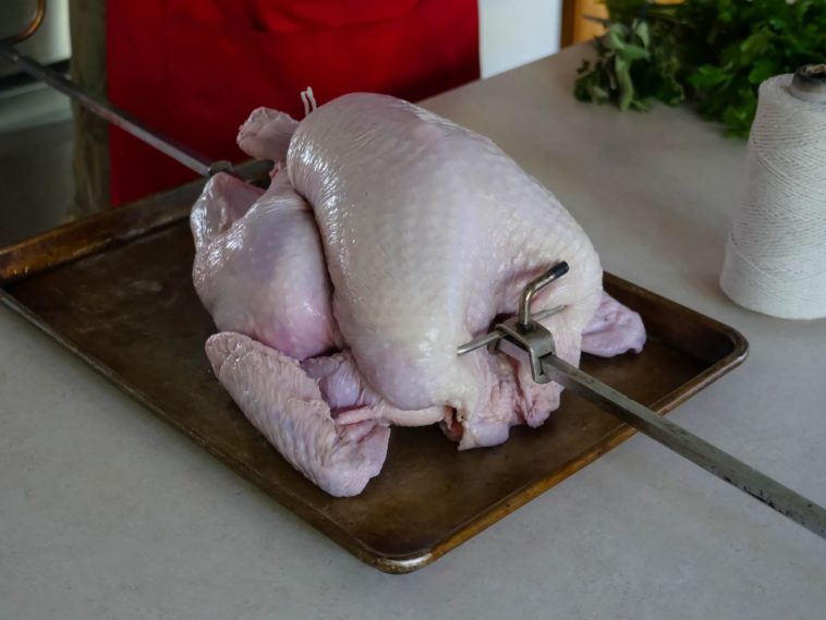 Insert the rotisserie spit into the cavity and push it until it pierces the other end of the bird. Center the mass of the bird on the spit as best you can. Insert the prongs on both ends and tightly secure the screws. Thread the turkey on the spit and fasten the prongs once the bird is centered on the shaft.
