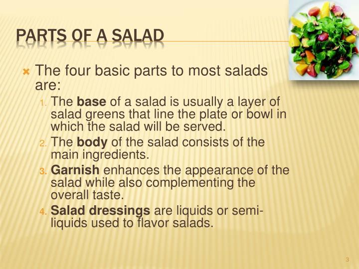 Additionally, What are the 4 basic parts of a salad?