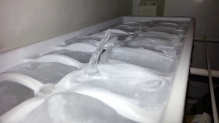 The water from the melted ice and frost drains through a short tube and into a pan beneath the refrigerator, where it evaporates. Should the drain line become clogged, the water has nowhere to go and it freezes, forming a layer of ice in the bottom of your freezer.