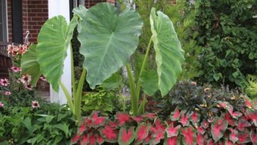 Elephant ears can become huge plants with gigantic leaves. Many spread through underground runners, or stolons, and send up baby plants along the way.