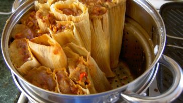 The tamales are done when the Masa Dough around the meat feels firm there are no parts of uncooked dough left. To test the tamales for doneness, remove one tamale from the steamer. Let this cool for a moment or two. As you open the husks, the dough should come away easily from the husks and be completely smooth.