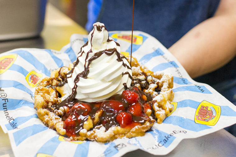 Unlike beignets, the funnel cake starts with a batter of eggs, milk, flour, brown sugar, vanilla and baking powder. Drizzled into a deep fryer, the resultant cake gets sprinkled with powdered sugar and optionally topped with apples, strawberries, or chocolate sauce.