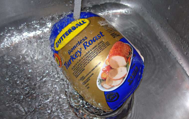 Per the USDA’s guidelines, you should never thaw frozen turkey on the counter or in hot water, nor should you leave it at room temperature for more than 2 hours.
