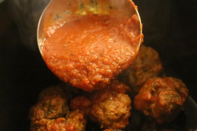 - Add ingredients. Pour frozen meatballs in slow cooker. Add your jar of spaghetti sauce, bbq sauce, or other sauce over the top so they’re all coated.