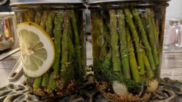 Within 24 hours of picking, they get to pickling in a garlicky brine with spices that include mustard and coriander seeds, allspice, black pepper, and bay leaves.