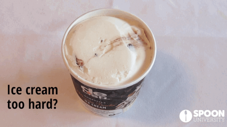 A suggested way to prevent ice cream from getting too cold and hard to scoop is to place the whole container in a freezer bag and press out the air before sealing it and placing it in the freezer. Supposedly the bag keeps the air around the ice cream from getting too cold, resulting in easily scoopable ice cream.