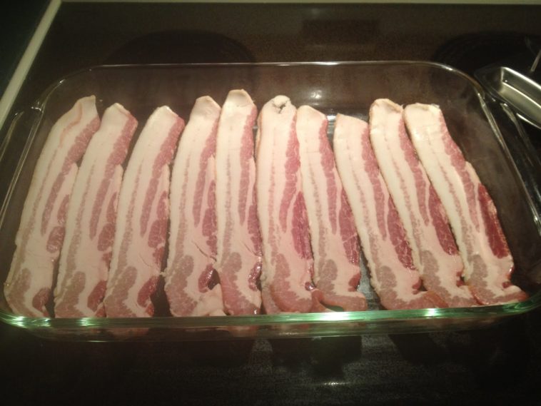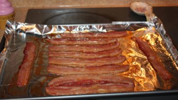 The foil is not required, but it does make cleanup very simple! Spread the bacon strips out across the sheet and place in a cold oven. I usually slice our bacon in half and a full pound fits on a baking sheet.