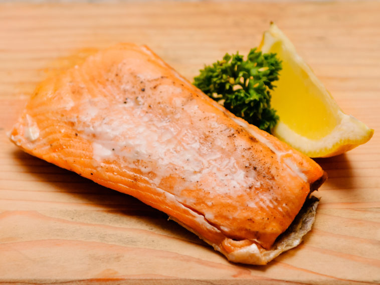 According to the FDA, salmon should be cooked to an internal temperature of 145°. When working with good quality salmon, we tend to check for doneness with a fork rather than a thermometer. Once the salmon easily flakes with fork, it’s good to go! Just be sure you’re checking the thickest part of the fillet.