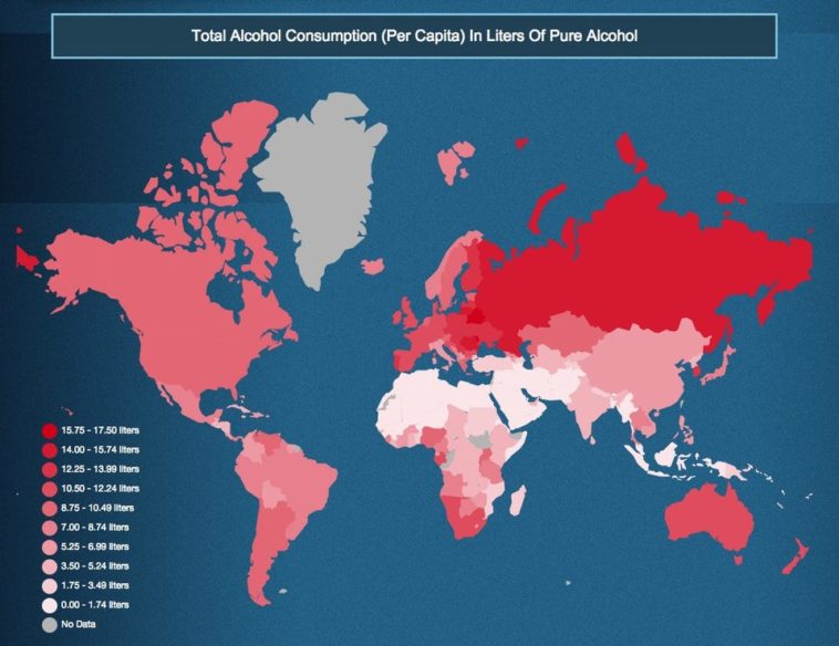 As far as alcohol consumption, the countries with the heaviest drinkers are: