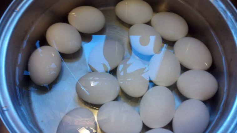 Use a large pan and limit cooking to two (2) dozen eggs at a time only. 5. Over high heat, bring water JUST to a rapid boil. As soon as the water reaches a rapid boil, remove pan from heat and cover egg pan tightly with a lid.