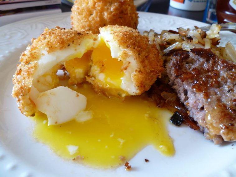 Deep-fried eggs are a special breakfast dish that is easy to make. Soft-boiled eggs are breaded and fried with a savory bacon breadcrumb coating so they have a delicious crispy coating. … These deep-fried eggs are actually very easy to make, but you do need a little patience to peel the eggs before you bread them.