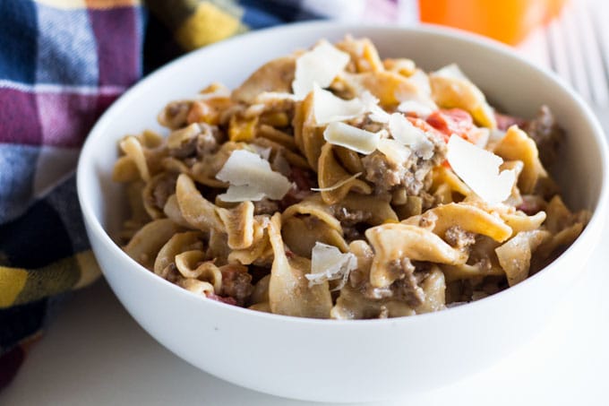 The main ingredients in hamburger helper are pasta, marinara sauce, ground beef and mozzarella cheese. My favorite ingredients ever! The only additions I’ve made are add ingredients that flavor the dish, like onion, garlic, must have garlic, lots of garlic, Italian seasoning, and chicken broth.