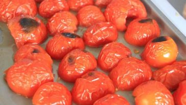 Slice the tomatoes in half, remove the stems, and place them cut–side down on a baking sheet. It’s fine to crowd them together. Broil the tomatoes until the skins are blackened and the tomatoes smell roasty, 12 to 15 minutes — check them every five minutes until done.