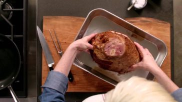 A fully cooked, ready-to-eat ham (also referred to as a « city ham ») can be sliced and served cold or at room temperature—there’s no need to reheat it. … Once you’ve chosen your glaze, place the ham, cut-side-down, in a heavy-duty aluminum foil-lined jelly-roll pan. Let it stand at room temperature for 30 minutes.