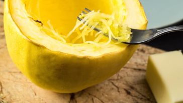The flesh will also separate easily into spaghetti-like strands. You can also taste it right now — if the noodles are still a bit crunchy for your taste, put the squash back in the oven for 15 to 20 minutes more.