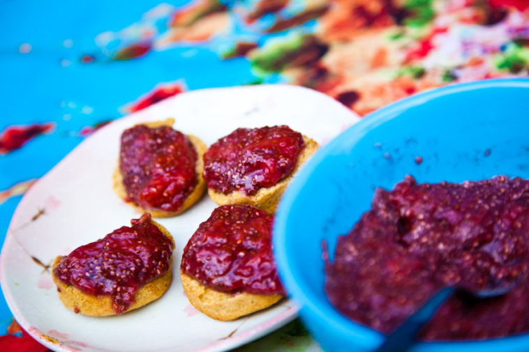 See, the truth is that the pectin web doesn’t really solidify until everything cools down. That means it’s tricky to tell whether you’ve achieved the gel point while the action is still hot and heavy. Enter the spoon: Before you start your jam, set a plate with a few metal spoons in the freezer.