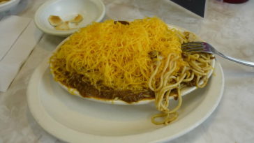 So Gold Star Chili is not as sweet as other Cincinnati chili restaurants, owing to the fact that it does not use chocolate or cinnamon nearly as much as the others do. Instead, the chili here is savory and tangy, it’s got a little bit of warmth to it like a spice or two.