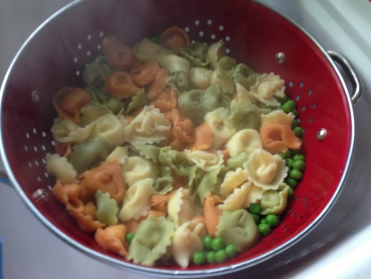 Tortellini is cooked when it sticks to the tooth when you bite it. If it’s not cooked, let the tortellini pasta boil on the stove for another minute, then check again. When the pasta is cooked to your liking, strain the pasta from the water.