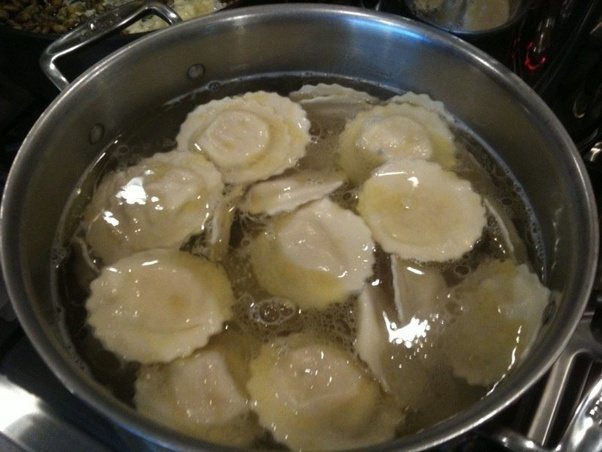 « If you made homemade ravioli and froze the leftovers, you don’t need to thaw it before cooking: Just boil it a little longer, about four to six minutes. » It’s done when it floats to the top. Microwaving fresh ravioli is equally easy. « Place it in a microwave-safe large bowl with 2 1/2 cups water.