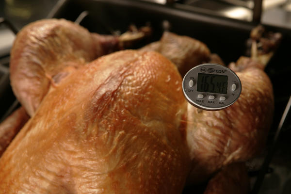 Note also that there is usually at least a 10-degree increase in temperature that comes in the 30 minutes between removing the bird from the oven and carving it. That “push” after roasting should result in a final temperature of around 175 degrees.