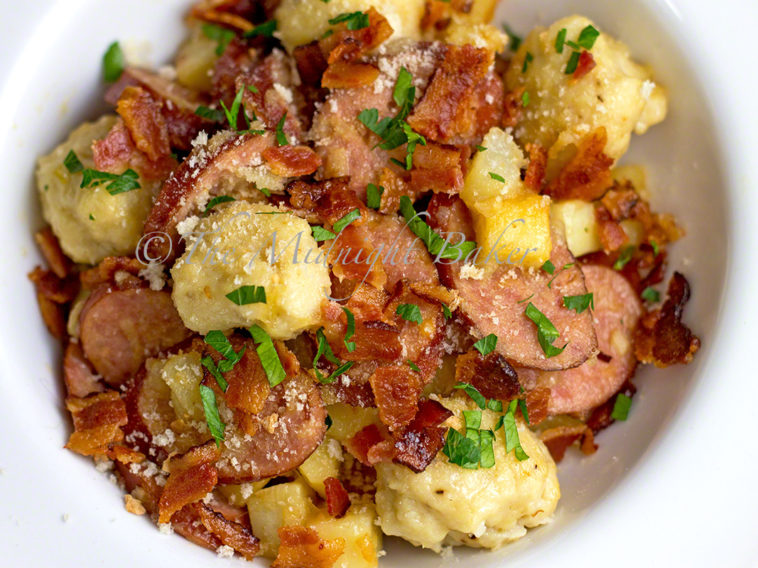 One of these meals was called the Poor Man’s Meal. It combined potatoes, onions, and hot dogs into one hearty, inexpensive dish, which was perfect for the hard times people had fallen on. I recreated this meal, which was extremely simple as well as inexpensive. First, you peel and cube a potato.