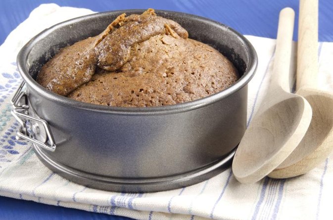 A dark metal pan absorbs and distributes heat more quickly and thoroughly than lighter-colored pans. So not only does your cake bake more quickly in a dark pan, its crust can potentially burn (or at least brown unpleasantly) due to over-exposure to oven heat.