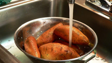 - Scrub the sweet potatoes, poke each in a few places with a fork, and place on the oven rack.