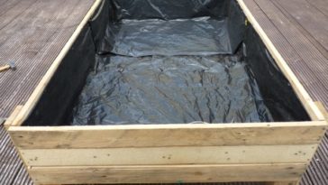 To protect the wood, line the planter inside with plastic, such as old plastic compost bags, fixing it with small nails. Make drainage holes before filling it with compost.
