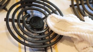 Using a cloth and a bit of mild dish soap and water, rinse any residue from the burner coils. Take care not to get any part of the the electrical connection wet, and don’t submerge any part of the burners. … Give it about 20 minutes to sit, then scrub and rinse the burner.