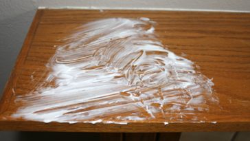 Get those white marks—caused by hot cups or sweating glasses—off your coffee table or other wooden furniture by making a paste of 1 tablespoon baking soda and 1 teaspoon water. Gently rub the spot in a circular motion until it disappears. Remember not to use too much water to remove water stains from wood.
