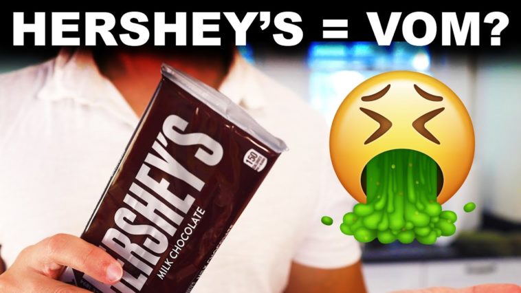 According to MailOnline, the chemical found in Hershey’s chocolate, vomit, parmesan cheese and sour butter is called butyric acid. … They also claim the butyric acid — which gives vomit its acidic smell and taste — gives American chocolate its « tangy » flavor.
