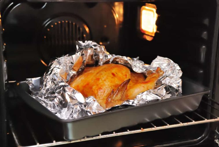 Since aluminum foil has a shiny side and a dull side, many cooking resources say that when cooking foods wrapped or covered with aluminum foil, the shiny side should be down, facing the food, and the dull side up.