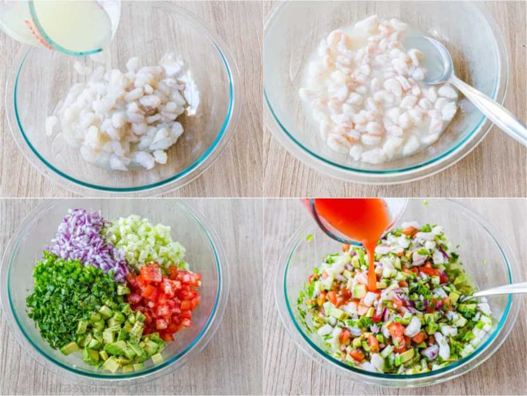 Place the shrimp in a large mixing bowl. Add 1/2 cup lime juice and let stand for 15 minutes so the shrimp can « cook » in the lime juice (any less and it won’t cook, any more and it toughens).