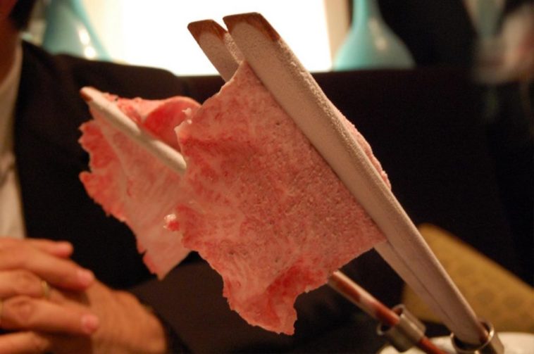 As it is raised it is fed beer, given regular massages, and allowed to lay on the couch watching television all day. When it is slaughtered it is spoken to very gently, given a special treat, and then killed suddenly so that it is dead before the muscles even have time to tense up.