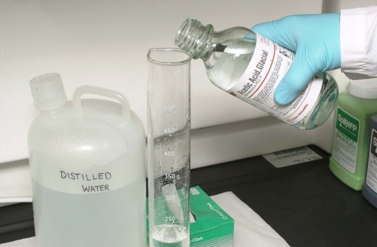 Carefully add 5 ml of glacial acetic acid into 95 ml of distilled water and mix thoroughly. Unused acetic acid should be discarded at the end of the day. Note: It is important to remember to dilute the glacial acetic acid, since the undiluted strength causes a severe chemical burn if applied to the epithelium.