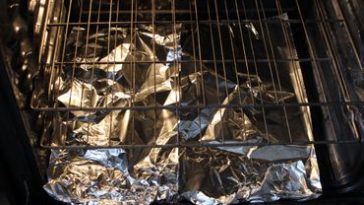 A simple sheet of aluminum foil can stop any spill from reaching the heating element of your oven and burning. There are two approaches to using foil. Line the bottom rack with a sheet of foil to catch anything dripping from above.