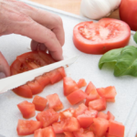 - Sliced tomatoes marinated in Italian dressing, served with slices of havarti cheese and garlic-stuffed green olives.
